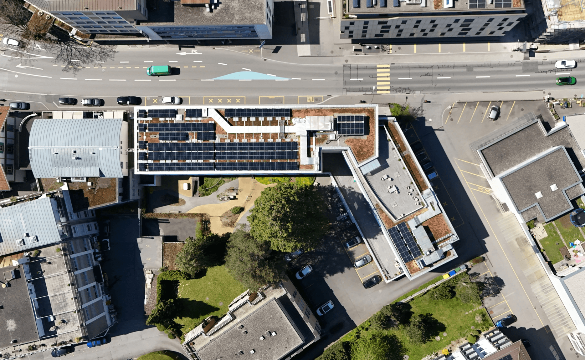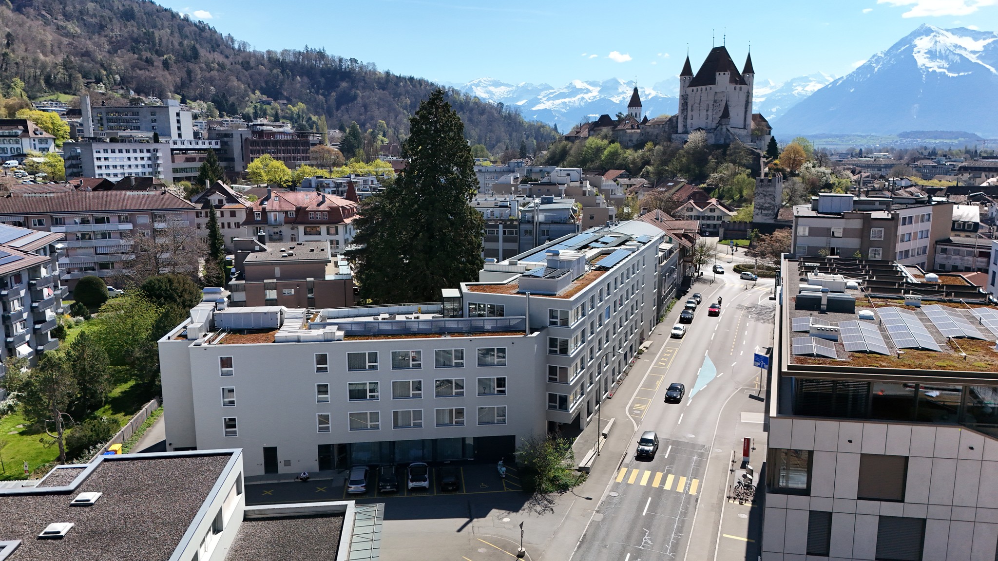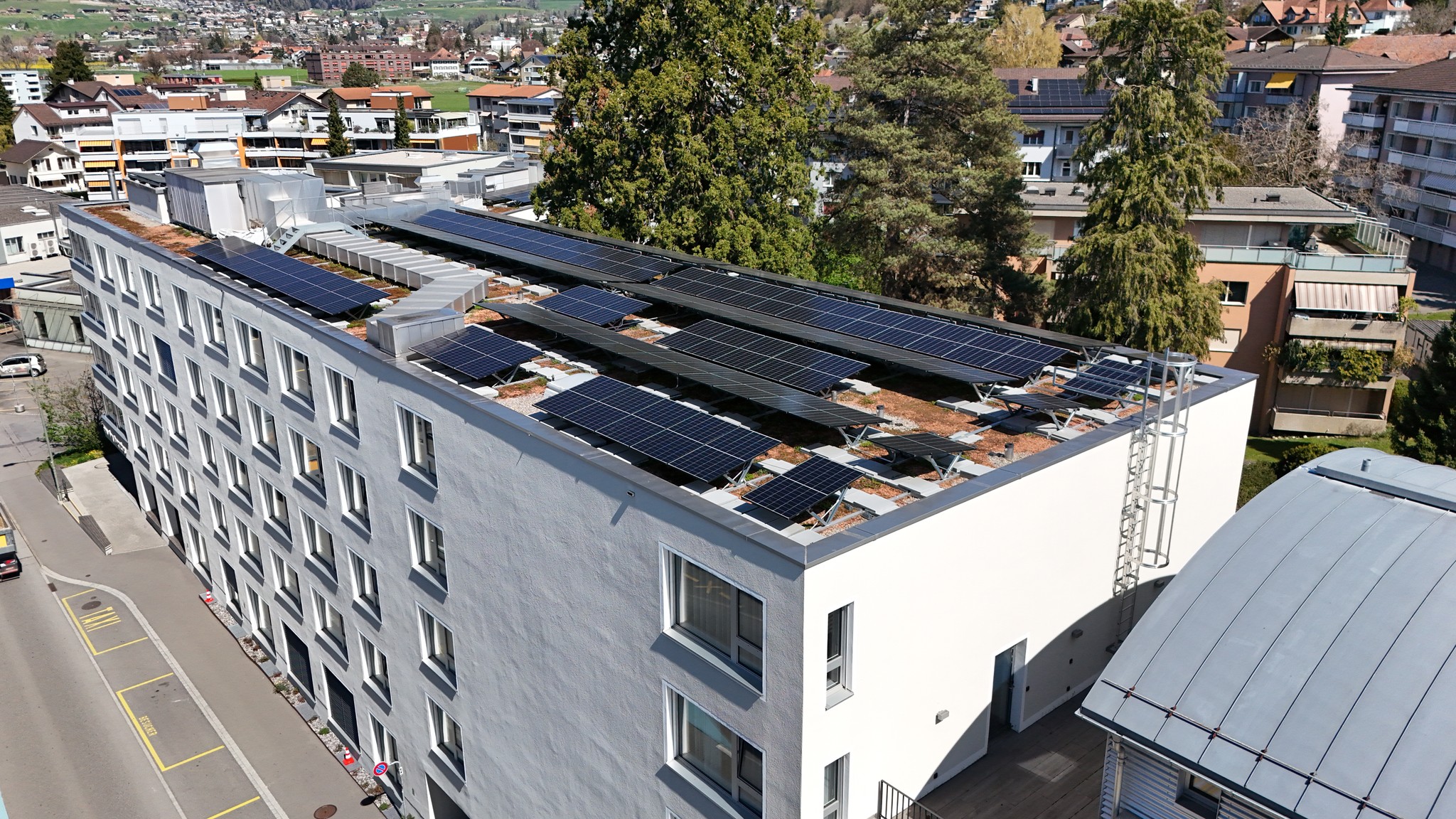 Auf dem Dach eines Pflegezentrums in Thun entstand eine leistungsstarke Photovoltaikanlage mit 73 kWp und 149 Modulen. Sie nutzt die Sonnenenergie effizient und wandelt sie in sauberen, nachhaltigen Strom um. Ein zukunftsorientiertes Investment in die Energieversorgung der Liegenschaft. Dank des hohen Stromverbrauchs wird ein Grossteil des produzierten Solarstroms direkt vor Ort genutzt. Dieser hohe Eigenverbrauch steigert die Wirtschaftlichkeit der Anlage erheblich und reduziert die Energiekosten. Mit einer Jahresproduktion von rund 70'000 kWh spart die Anlage etwa 8,9 Tonnen CO₂ ein.