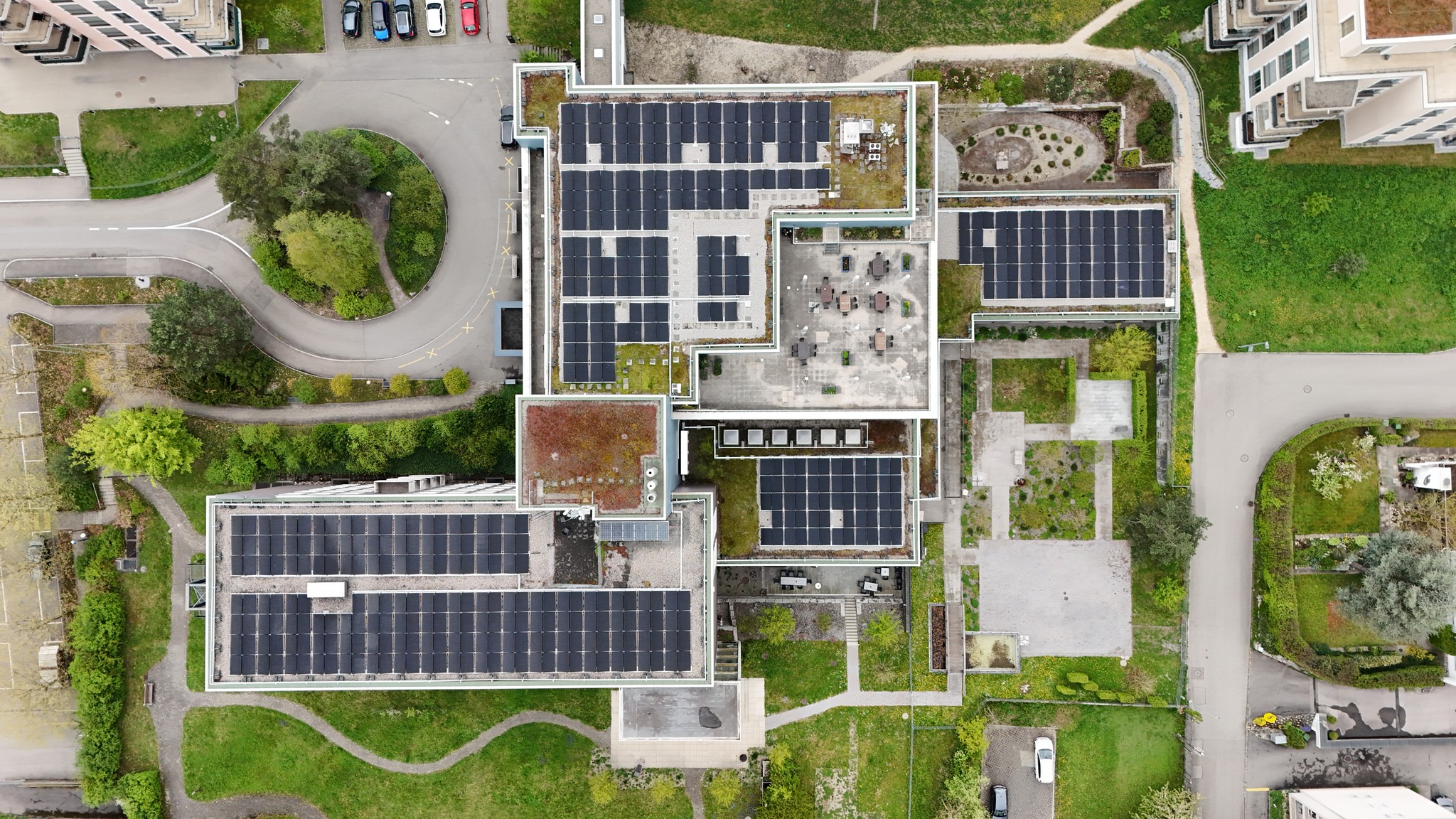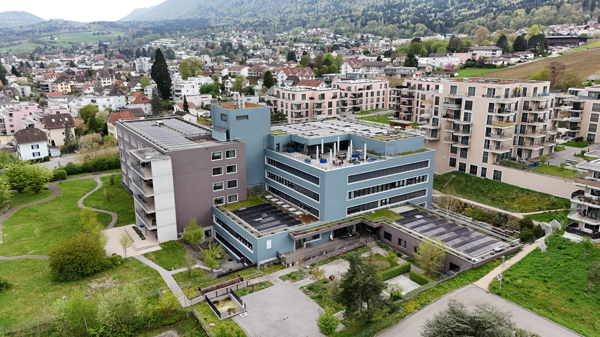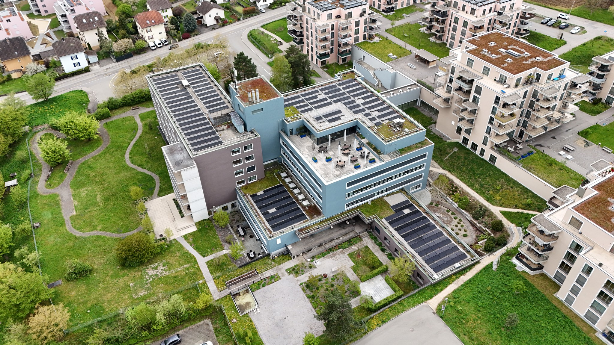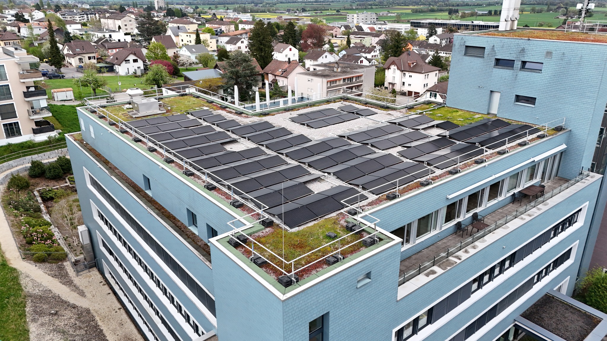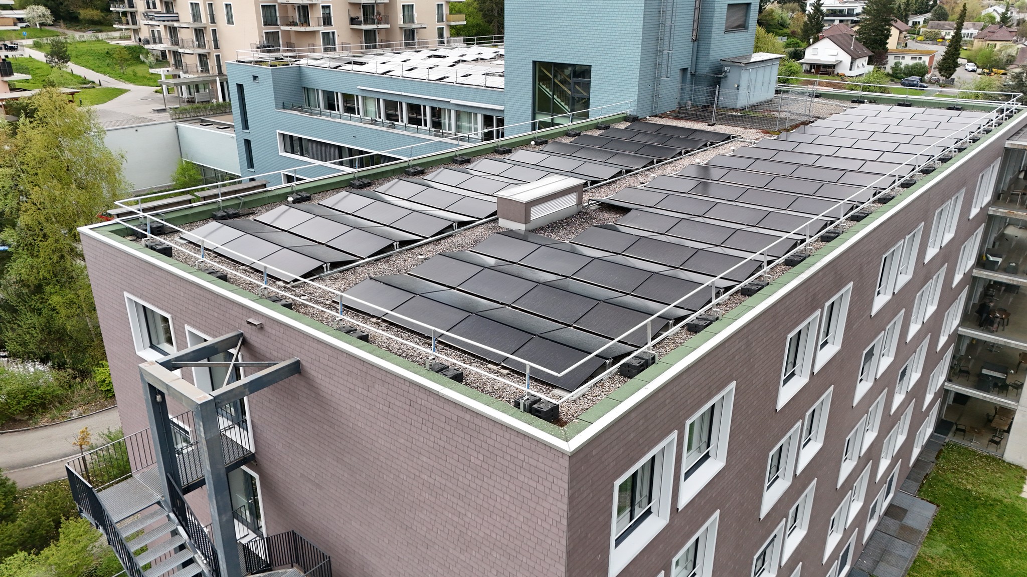 Auf dem Dach eines Pflegezentrums in Thun entstand eine leistungsstarke Photovoltaikanlage mit 73 kWp und 149 Modulen. Sie nutzt die Sonnenenergie effizient und wandelt sie in sauberen, nachhaltigen Strom um. Ein zukunftsorientiertes Investment in die Energieversorgung der Liegenschaft. Dank des hohen Stromverbrauchs wird ein Grossteil des produzierten Solarstroms direkt vor Ort genutzt. Dieser hohe Eigenverbrauch steigert die Wirtschaftlichkeit der Anlage erheblich und reduziert die Energiekosten. Mit einer Jahresproduktion von rund 70'000 kWh spart die Anlage etwa 8,9 Tonnen CO₂ ein.
